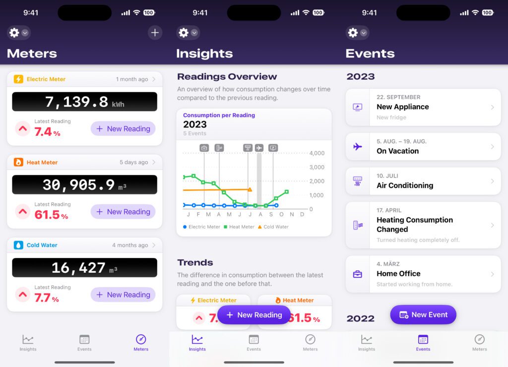 Ab heute gibt es die iPhone-App MeterStats von Alexander Käßner im App Store. Mit MeterStats können Zählerstände notiert und gegenübergestellt werden. So lässt sich der Verbrauch von Strom-, Heizungs- und Wasseranschluss beobachten. Die Trends im Verbrauch werden dabei automatisch berechnet und sowohl als Prozentwerte als auch in Form von Diagrammen angezeigt. Sehr durchdacht ist außerdem, dass sich bestimmte Vorkommnisse notieren lassen – Urlaube, Besuche, Anbieterwechsel, etc. So können Gründe für Verbrauchs- und Kostenänderungen ermittelt werden. Zum Start gibt es die App nur auf englisch, Alexander hat uns aber mitgeteilt, dass die deutsche Übersetzung zeitnah realisiert werden soll.