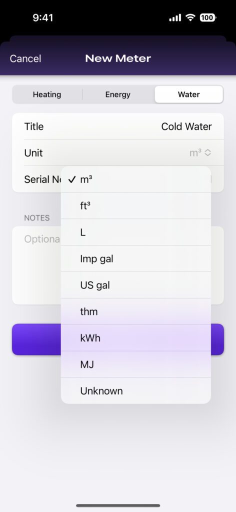 Im Meters-Tab lassen sich auf einen Blick alle hinterlegten Zähler einsehen. Zudem wird der zuletzt eingetragene Verbrauchsstand inklusive der seitdem vergangenen Zeit angezeigt. So sieht man direkt, wenn mal wieder ein Gang zum Zähler notwendig wird. In der Übersicht wird übrigens auch direkt angezeigt, um wie viel Prozent der Verbrauch gegenüber des letzten Vergleichszeitraums gestiegen oder gesunken ist. Für verschiedene Regionen und Zähler können übrigens unterschiedliche Einheiten gewählt werden – für den Wasserverbrauch also neben m³ auch Liter, gal, und ft³.