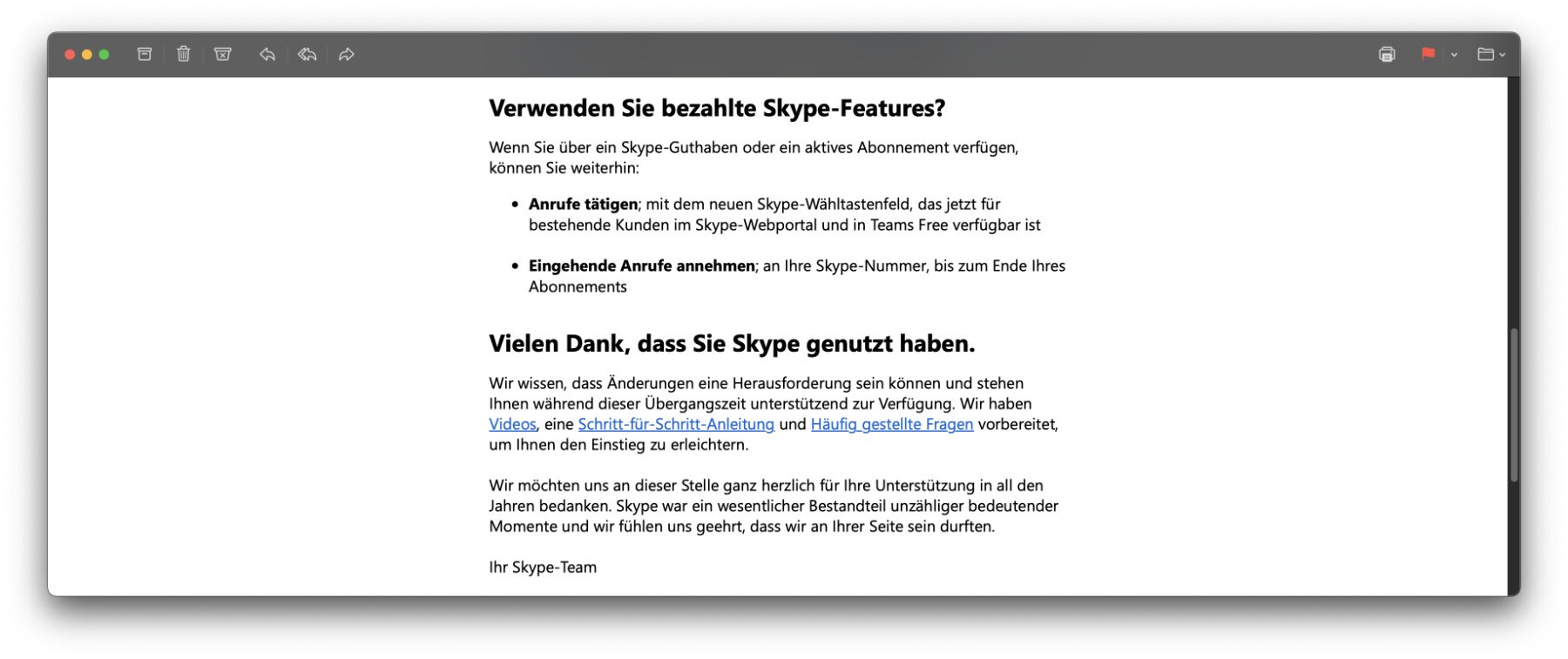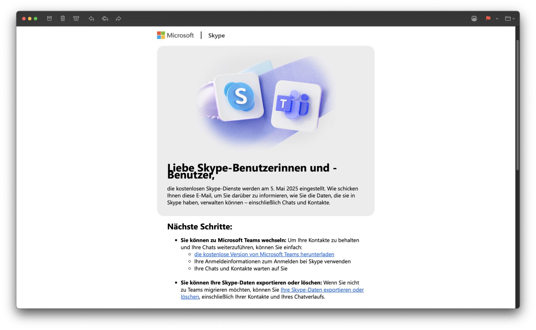 Microsoft hat der 22 Jahre alten Videotelefonie-App Skype vorgestern den Stecker gezogen. Gestern ging dann bei Usern von Skype eine E-Mail mit weiteren Informationen zum Thema ein. Als „nächste Schritte“ wurden dabei neben dem Umzug zu Microsoft Teams der Export und die Löschung von Skype-Daten als Optionen aufgezeigt.