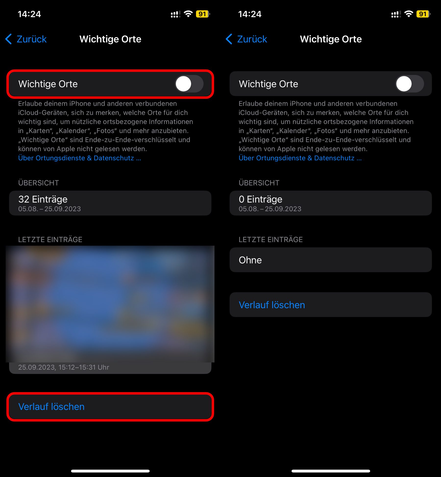 Ihr könnt das Ganze ausschalten, indem ihr unter Einstellungen -> Datenschutz & Sicherheit -> Ortungsdienste -> Systemdienste -> Wichtige Orte den Schalter deaktiviert (er ist dann nicht mehr grün, sondern grau). Zudem könnt ihr dort ganz unten den „Verlauf löschen“-Button nutzen, um die bisher gemerkten Orte zu entfernen.