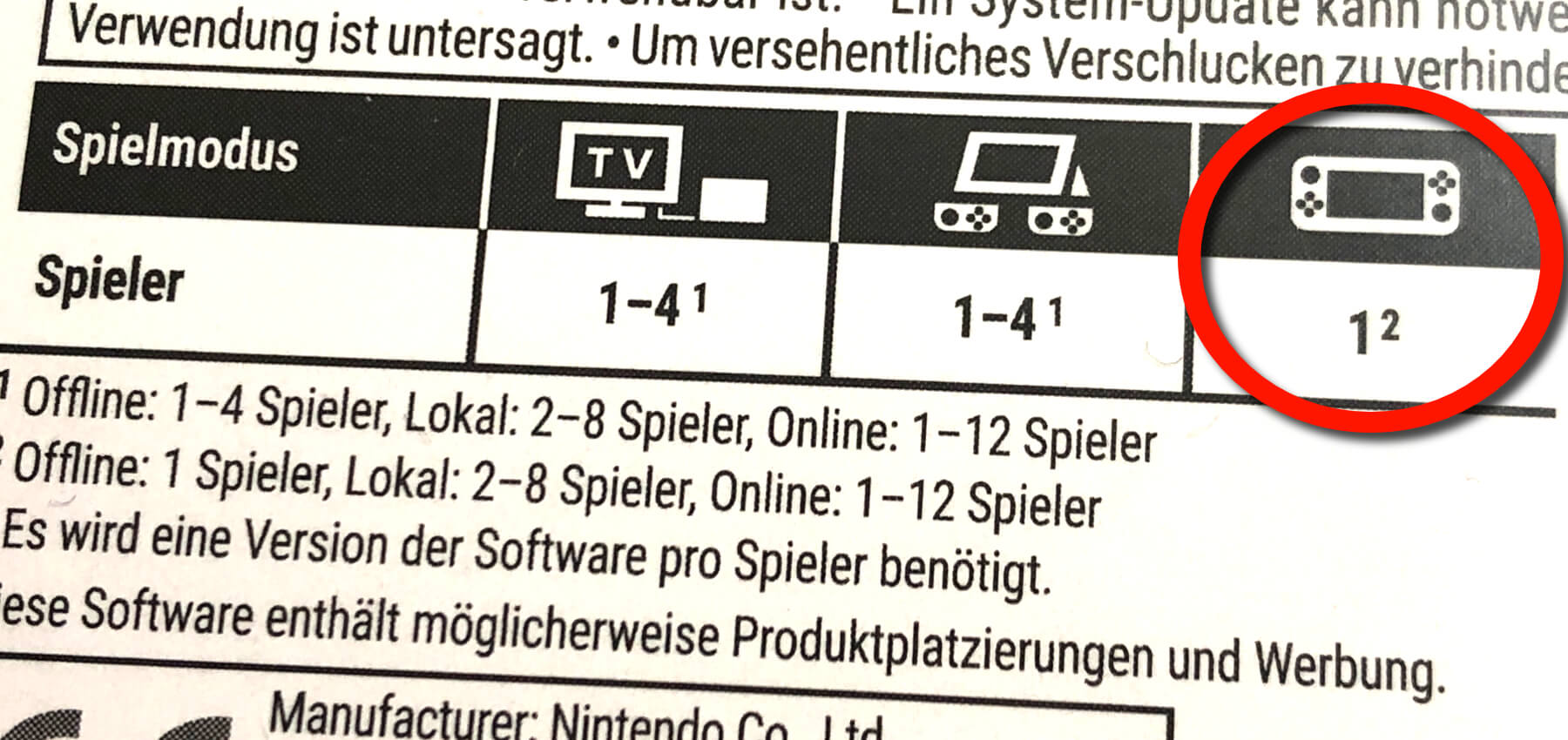 Beim Neukauf eines Spiels solltet ihr, wenn ihr ausschließlich die Lite-Switch für die Nutzung zur Verfügung habt, auf den sogenannten „Handheld-Modus“ achten. Ob dieser vom jeweiligen Game unterstützt wird, seht ihr auf der Rückseite der Spielehülle. Dort gibt es meistens eine kleine Tabelle mit den Zeilen „Spielmodus“ und „Spieler“. Sie zeigt euch, welcher Modus spielbar ist und wie viele Teilnehmer möglich sind. Hier ein Beispiel von Mario Kart 8 Deluxe: