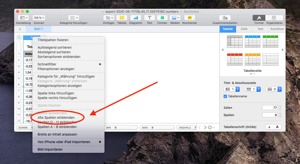 - Im offenen Menü wählen wir nun "Alle Spalten einblenden".