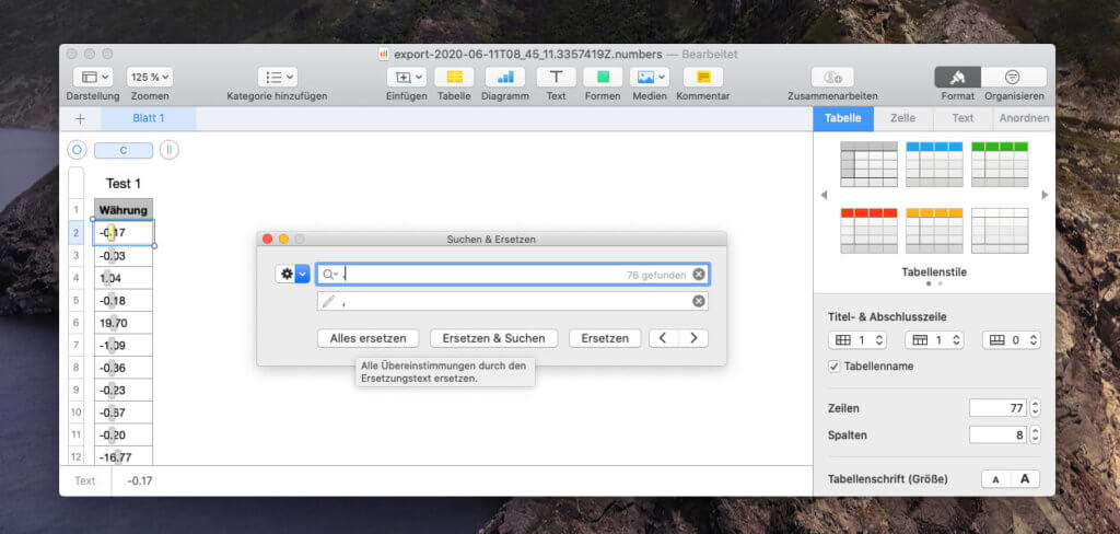 - Über die Tastenkombination CMD + F rufen wir die Funktion "Suchen und Ersetzen" aus und führen unseren Ersetzungswunsch aus. In meinem Fall war es Suchen nach Punkt und Ersetzen durch Komma.