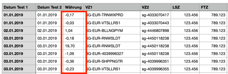 Nun gab es in unserer Tabelle leider andere Spalten, in denen auch Punkte vorkamen. Diese standen unter anderem im Datum, in Artikelbeschreibungen und ähnlichen Feldern. Das Suchen und Ersetzen sollte jedoch nur auf die eine Spalte mit der Währung begrenzt sein.