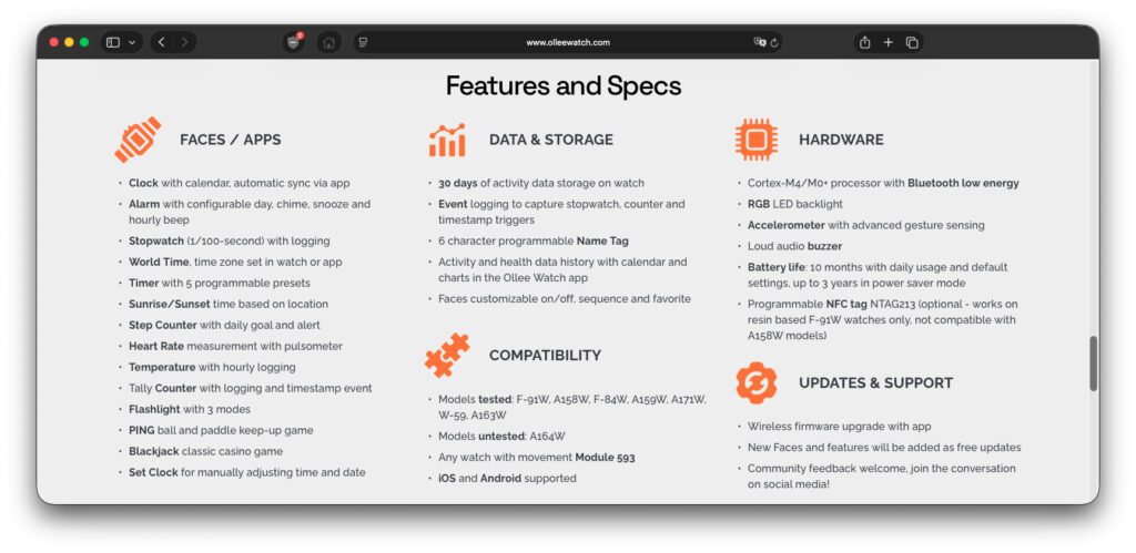 Auf der Webseite des Projekts gibt es sowohl Ollee-Watch-Module, die man selbst in die vorhandene Casio-Uhr einbauen kann, als auch fertig modifizierte Uhren. Weiterhin werden eine Installationsanleitung als Video, die Links zu den iOS- und Android-Apps sowie ein FAQ für weitere Infos angeboten. Die Seite ist in Englisch gehalten und wird von den USA aus betrieben.
