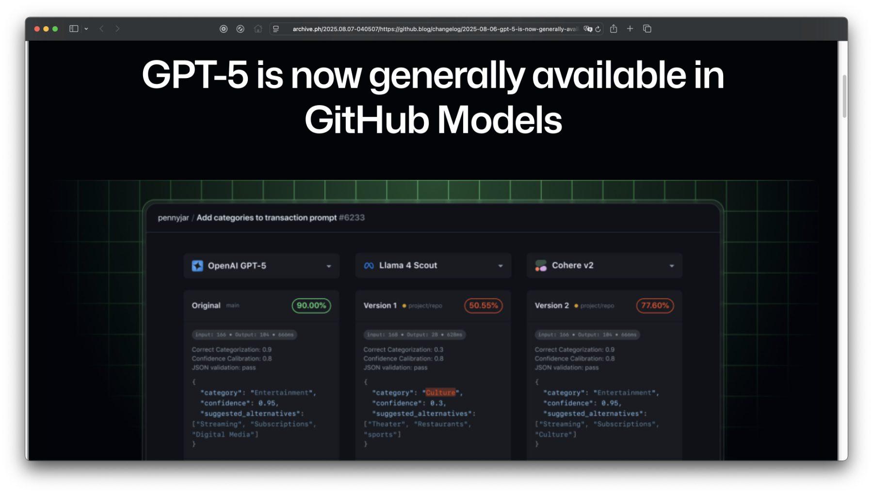 Der bereits wieder von GitHub entfernte – aber zuvor archivierte – Blogbeitrag mit dem Titel „GPT-5 is now generally available in GitHub Models“ gibt Aufschluss über das neue Sprachmodell für den ChatGPT-Chatbot und weitere Anwendungen. GPT-5 soll Verbesserungen im Reasoning, in der Code-Qualität und in der allgemeinen Nutzungserfahrung bieten. Komplexe Programmier-Aufgaben sollen durch minimale Prompts angestoßen werden können.