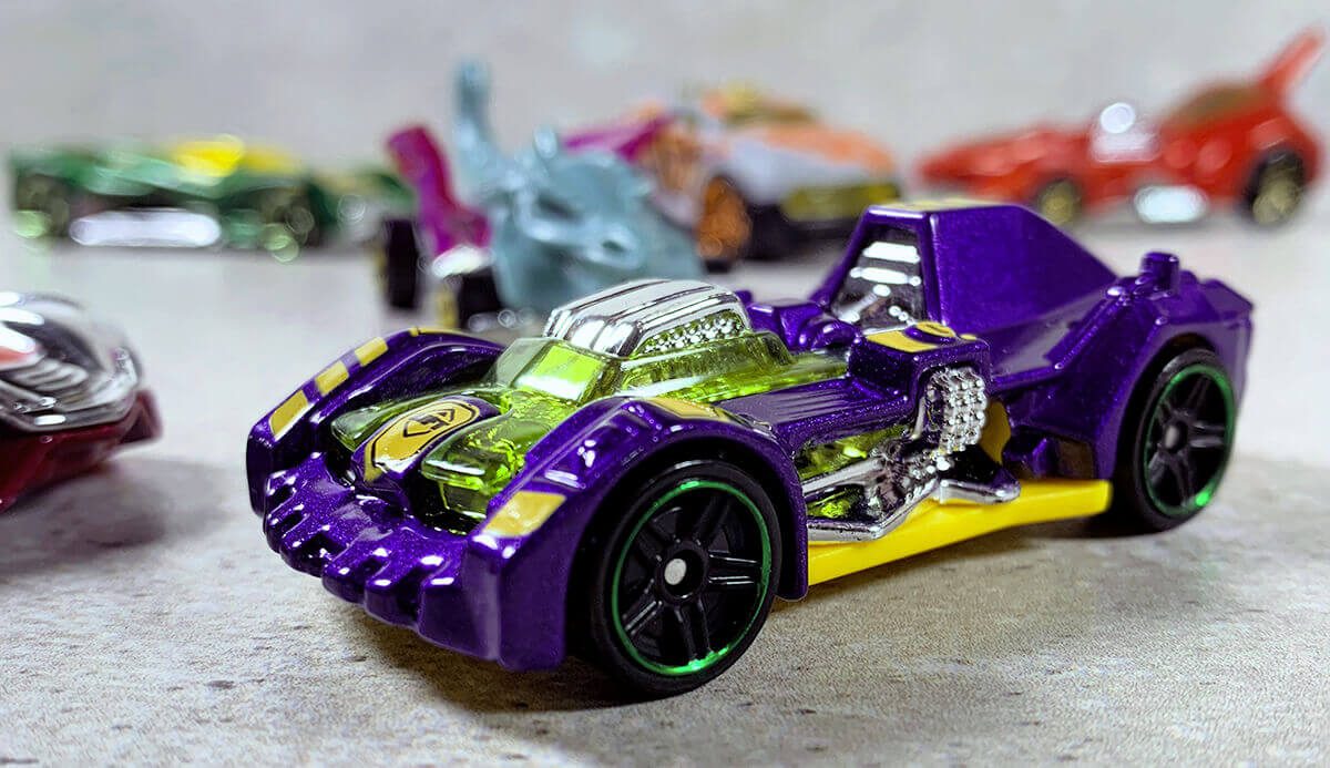 Mit im Set kommt noch eine Box mit sechs verschiedenen Hot Wheels Fahrzeugen, die alle Geschmäcker befriedigen dürften. Vom eleganten Sportwagen über ein kleines Mini-Knubbelauto bis bin zu einem Drachen auf Rädern ist hier für jeden was dabei.
