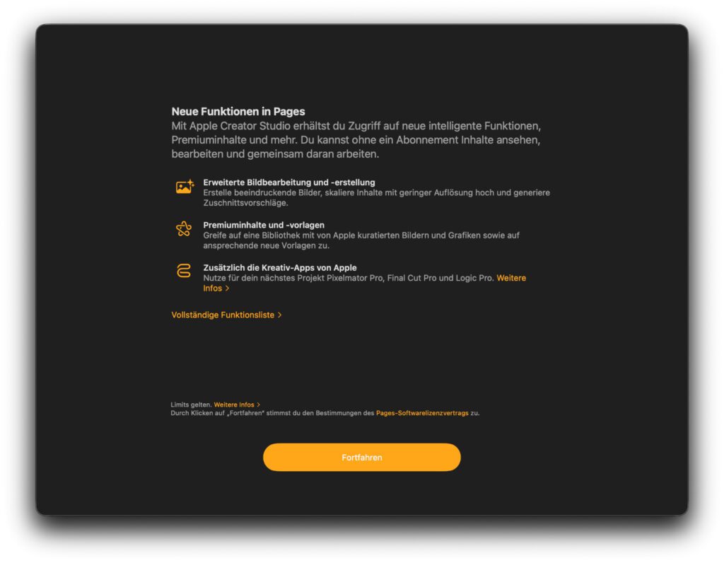 Ich habe mir die neuen iWork Apps der Version 15 aus dem Mac App Store geladen. Direkt beim Start derselben wird auf das neue Abo hingewiesen: „Creator Studio. Willkommen bei Pages“, heißt es etwa bei der Textverarbeitung. Erst nach einem Klick auf den Fortfahren-Button geht es weiter.