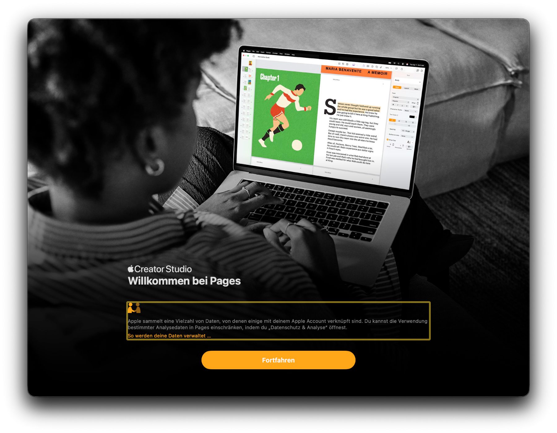 Ich habe mir die neuen iWork Apps der Version 15 aus dem Mac App Store geladen. Direkt beim Start derselben wird auf das neue Abo hingewiesen: „Creator Studio. Willkommen bei Pages“, heißt es etwa bei der Textverarbeitung. Erst nach einem Klick auf den Fortfahren-Button geht es weiter.