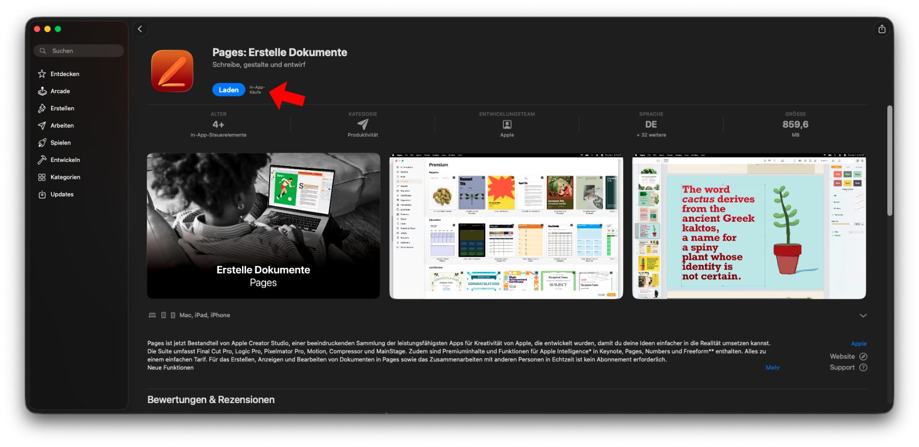 Im App Store findet man z. B. In-App-Käufe für Pages für 12,99€ im Monat oder 129,00€ im Jahr. Diese Preise beziehen sich aber auf das komplette Creator Studio, nicht nur auf Pages.