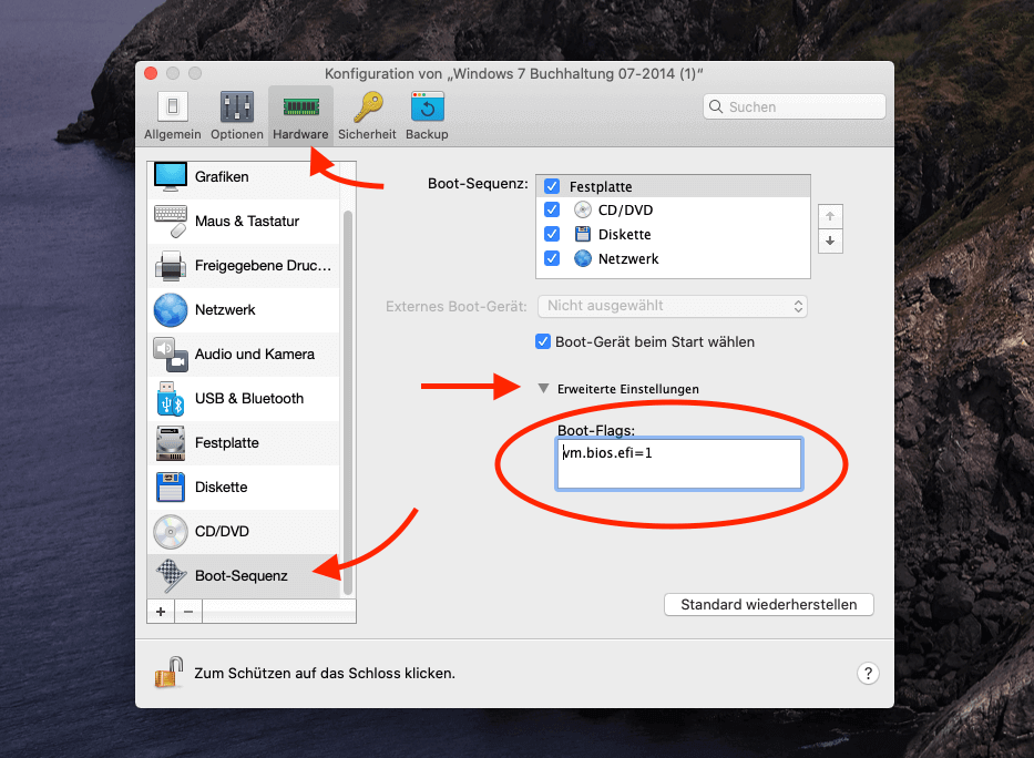 - Auf den Punkt "Hardware" klicken und in der Leiste die Einstellungen für "Boot-Sequenz" auswählen