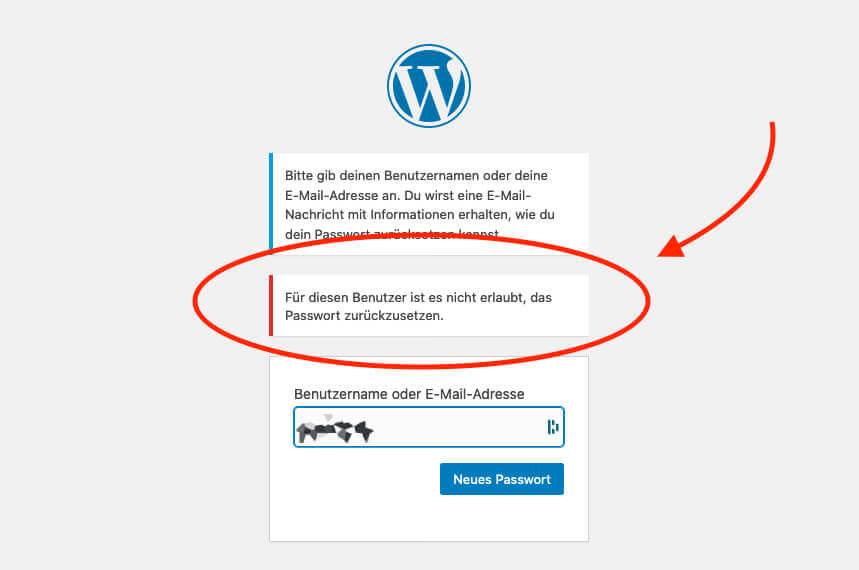 Man kann zwar weiterhin das Formular dazu aufrufen und auch eine E-Mail-Adresse oder einen Usernamen eingeben, aber dann erhält man folgende Fehlermeldung: