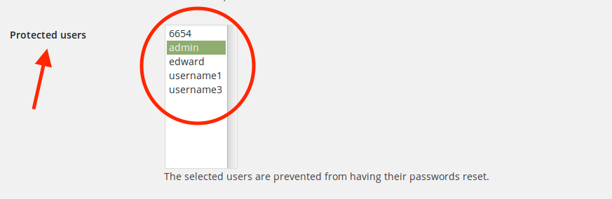 Im zweiten Feld „Protected users“ wählt man nun mit gedrückter CMD- bzw. STRG-Taste alle User aus und geht unten auf „Save settings“. Nun können bei allen Benutzern die Passwörter nicht mehr über die Passwort-vergessen-Funktion geändert werden.