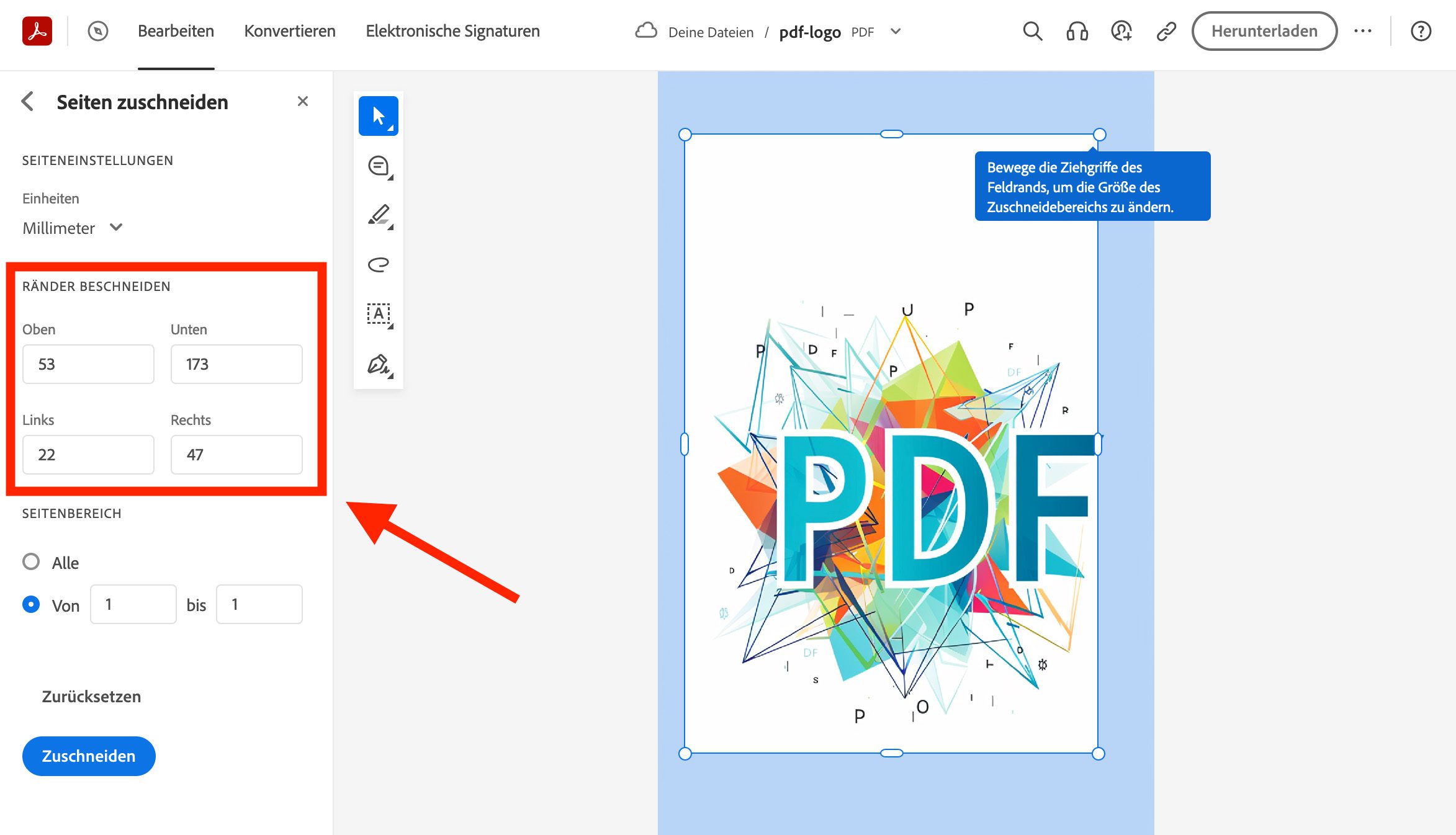 Um die richtigen Werte zu ermitteln, muss man also die aktuellen Abmessungen der PDF-Datei kennen und dann die Größe des Endformats davon subtrahieren. Dann gibt man diese Werte für jeden Rand ein und bestätigt den Zuschnitt.