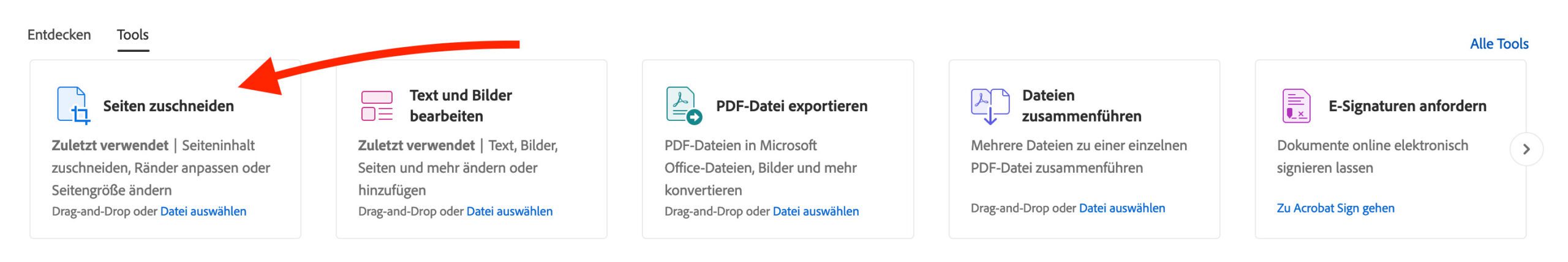 Dort logt man sich ein und findet dann unter den Tools auch die Möglichkeit "PDFs zuschneiden", wie hier im Screenshot zu sehen.
