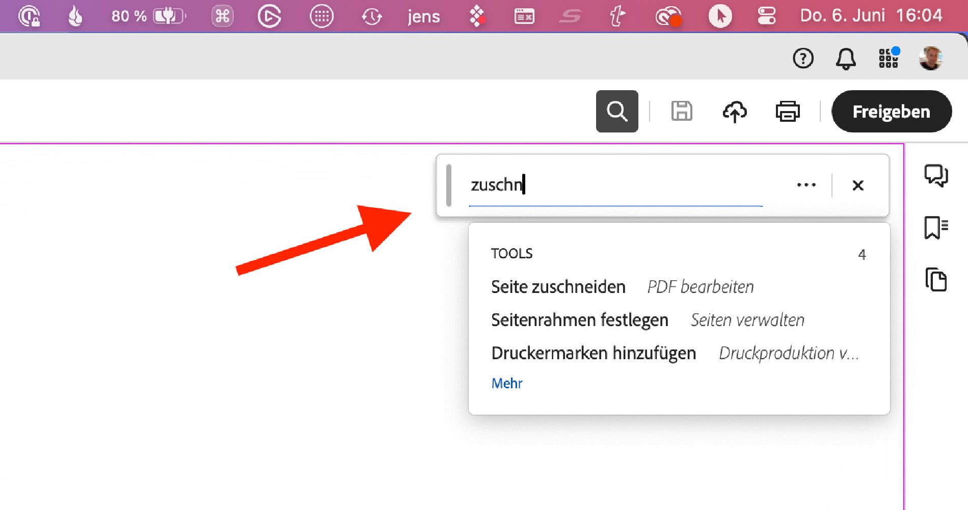 Es gibt nur ein Tool, mit dem man einen Rahmen zeichnen kann, der dann quasi die Größe der neuen Seite beschreibt. Absolut nicht zu gebrauchen, wenn man ein Dokument für eine Druckerei auf genaue Maße zuschneiden möchte. Ich habe auch die Vorschau-App von macOS ausprobiert, aber da hat man das gleiche Problem: Es lässt nur ein Zuschneiden nach Augenmaß zu – und komischerweise sind Druckereien damit nicht glücklich. ;-)