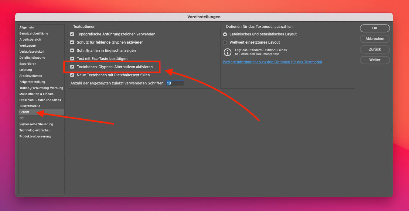 - Option "Textebenen-Glyphen-Alternativen aktivieren" deaktivieren