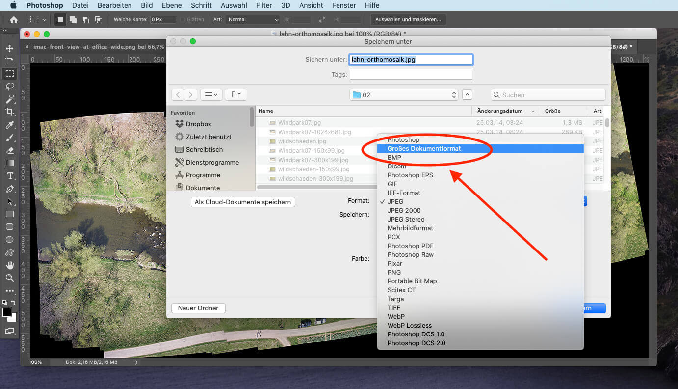 Ich hatte das Problem mit der 2GB-Grenze zum Beispiel bei einer Aufnahme eines Flusslaufes, die ich für ein Umweltamt mit der Drohne erstellt habe. Diese Orthofotografie bestand aus vielen Einzelbildern, die zusammengesticht wurden. Da das zusammengerechnete Bild aus über 200 Einzelbildern mit jeweils 24 Megapixeln bestand, war die Gesamtauflösung das Orthofotos natürlich immens. Nach anfänglichem Grübeln über die Fehlermeldung kam ich dann auch zu der Lösung mit dem "Photoshop, großen Dokumentenformat (PSB)".