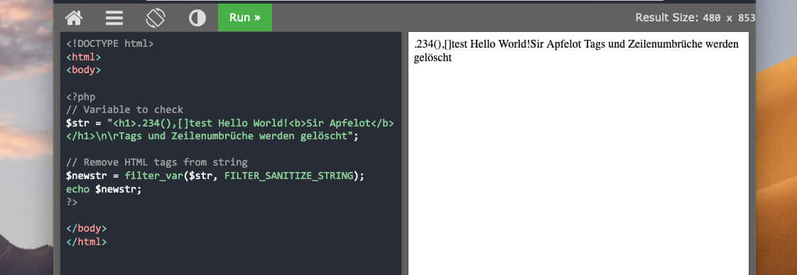 Damit habe ich ausprobiert, welche Zeichen bei der PHP-Funktion FILTER_SANITIZE_STRING aus dem String herausgefiltert werden. Wie sich herausgestellt hat, ist die Funktion perfekt, um Daten aus Formularfeldern zu bereinigen, um möglichen Schadcode zu entfernen.