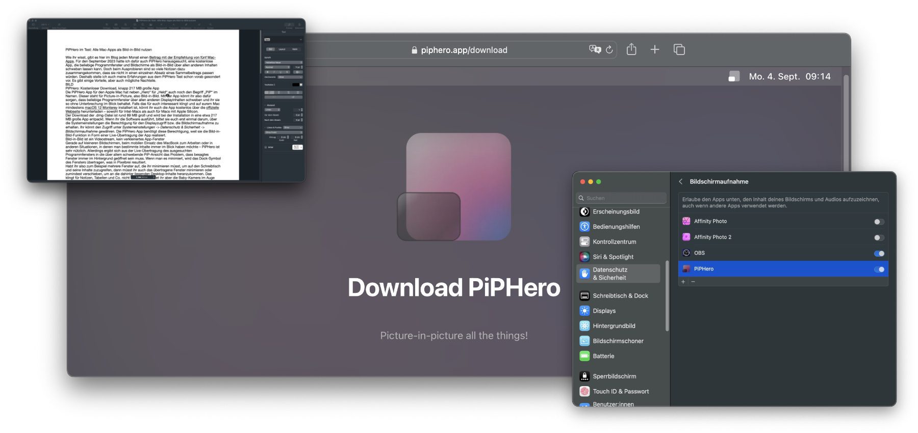 Der Download der .dmg-Datei ist rund 89 MB groß und wird bei der Installation in eine etwa 217 MB große App entpackt. Wenn ihr die Software ausführt, bittet sie euch erst einmal darum, über die Systemeinstellungen die Berechtigung für den Displayzugriff bzw. die Bildschirmaufnahme zu erhalten. Ihr könnt den Zugriff unter Systemeinstellungen -> Datenschutz & Sicherheit -> Bildschirmaufnahme gewähren sowie später auch wieder zurückziehen. Die PiPHero App benötigt diese Berechtigung, weil sie die Bild-in-Bild-Funktion in Form einer Live-Übertragung der App realisiert.