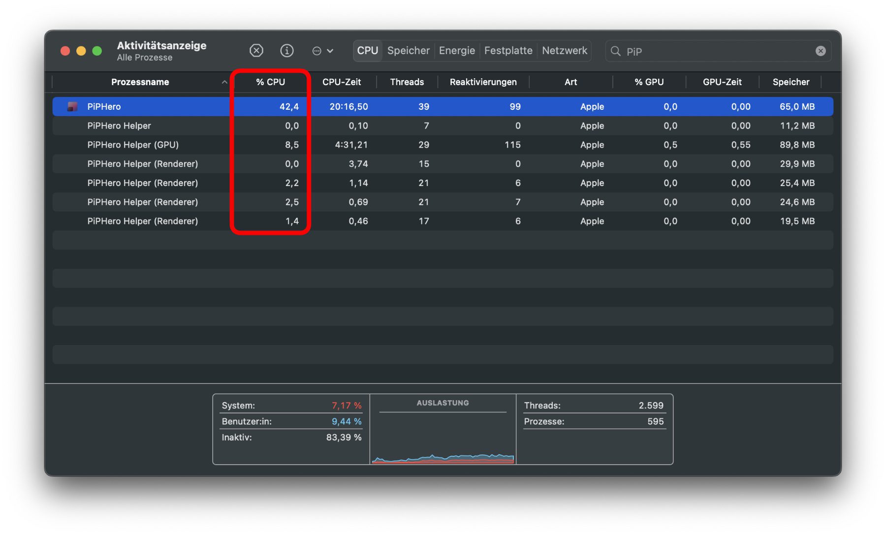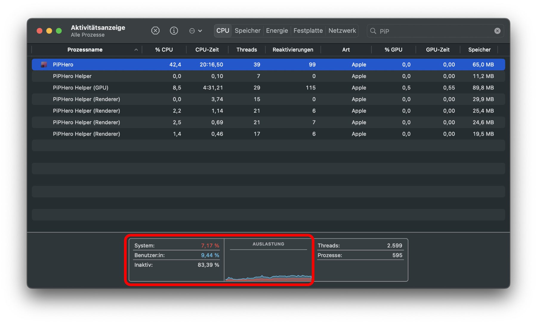 Das klingt nach viel, aber ich bemerke es nicht. Es zeigt sich kein Beachball of Death, nichts ruckelt oder stottert, die Lüfter bleiben aus, die Musikwiedergabe bricht nicht ab, die Lautsprecher knacken nicht, etc. Also habe ich mal genauer hingeschaut – und siehe da, in der Graphen-Darstellung der CPU-Last ist nichts von den hohen Prozentzahlen zu sehen. Da werden durchschnittlich 20% CPU-Last ausgezeichnet, und das für alle geöffneten Apps (inkl. Safari, Musik, Mail, Affinity Photo, etc.), drei PiPHero-Anzeigen, individuelle Systemeinstellungen, Verbindungen, etc.