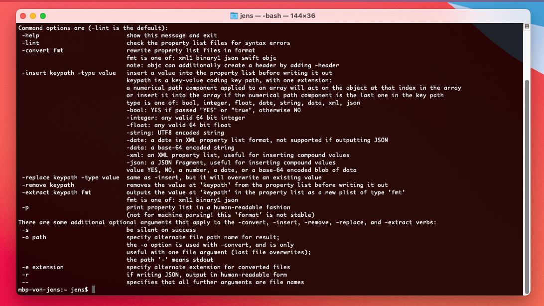 Es gibt noch einige weitere Formate, die plutil als Ziel anbietet, aber diese kann man sich mit dem Befehl "plutil -help" anzeigen lassen.