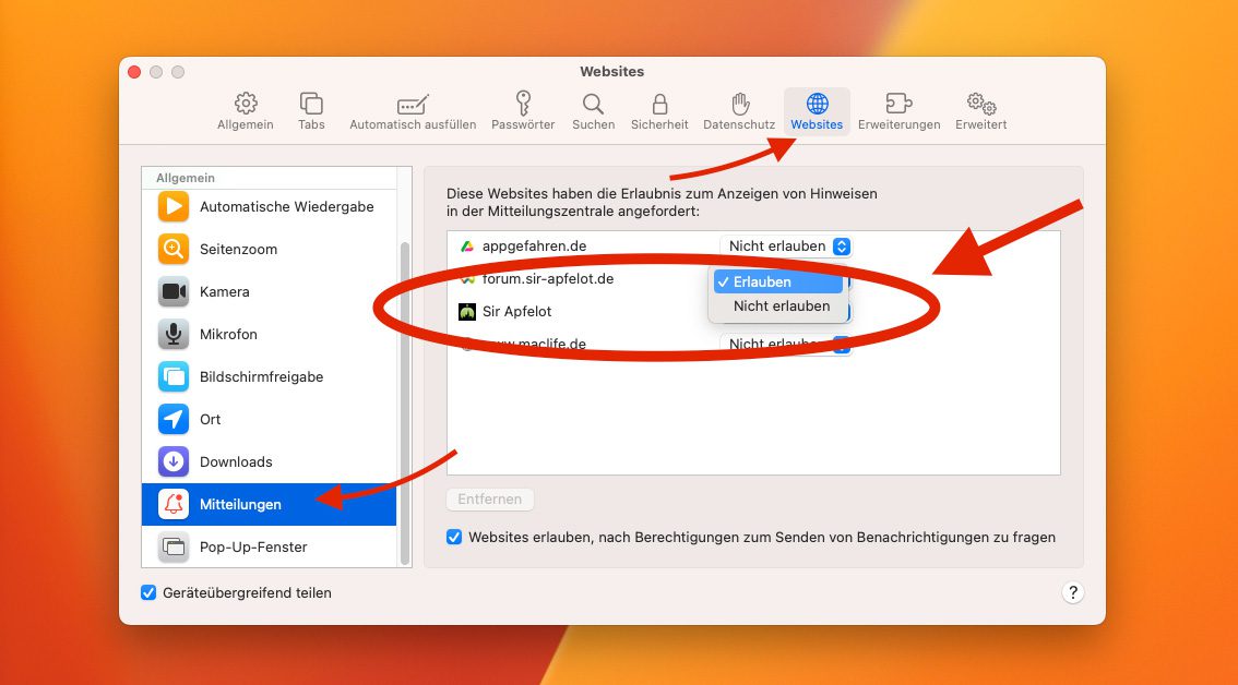Die Sache wurde interessant, denn wenn es keine böse App ist, was blieb dann, noch? Eine kurze Recherche bei Google brachte mit zum Apple Support Forum, in dem jemand ein ähnliches Problem hatte. Im Forenbeitrag war der entscheidende Hinweis: Die Meldungen, die zwar aussehen, als kämen sie vom macOS selbst, kommen tatsächlich über eine Webseite, der man irgendwann einmal die Erlaubnis gegeben hat, Benachrichtigungen über die Mitteilungszentrale zu schicken.