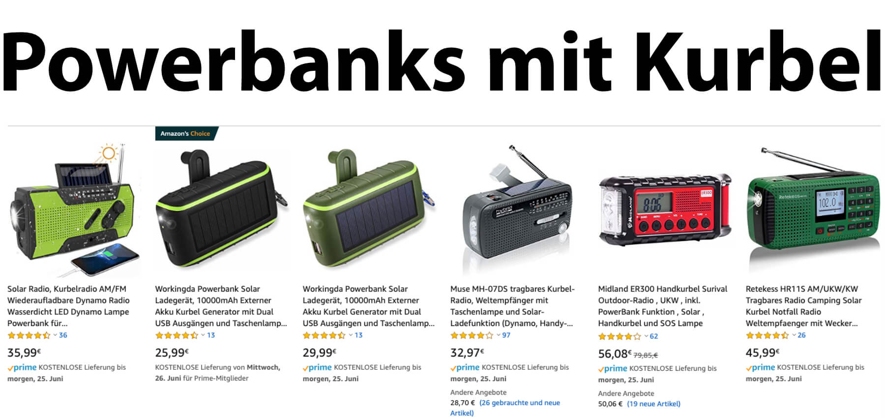 Eine Powerbank mit Kurbel, also ein Kurbelgenerator mit Stromspeicher, bringt meist auch andere Möglichkeiten zum Aufladen mit. So kann man den externen Akku auch per USB und teilweise per Solar-Panel aufladen. Auf Amazon gibt es sogar Multifunktionsgeräte, die neben der Dynamokurbel und der Nutzung von Sonnenenergie auch mit einer Taschenlampe und einem Radio ausgestattet sind – teils mit Wecker, Aufnahmefunktion und, und, und. Die komplette Übersicht der Amazon-Angebote mit guten Kundenbewertungen findet ihr mit diesem Link. Im Folgenden ein paar Beispiele von einfacher Ausführung bis Alleskönner.