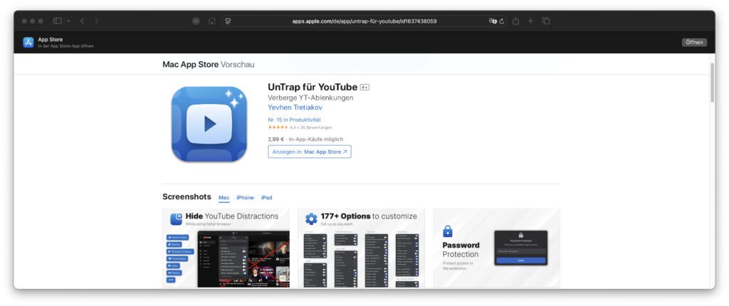 Die Safari-Erweiterung UnTrap bietet für einmalig 2,99€ die Möglichkeit, zahlreiche YouTube-Funktionen und -Bereiche individuell zu deaktivieren. Dazu gehören verwandte Videos, Kommentare, Shorts, der Live-Chat während Streams, die Suchleiste und nicht zuletzt Werbe-Banner. Ein Timer hilft außerdem dabei, den Zugriff auf die YouTube-Webseite zu beschränken. Er kann für bestimmte Tage eingerichtet sowie für einzelne Sitzungen individuell angepasst werden.