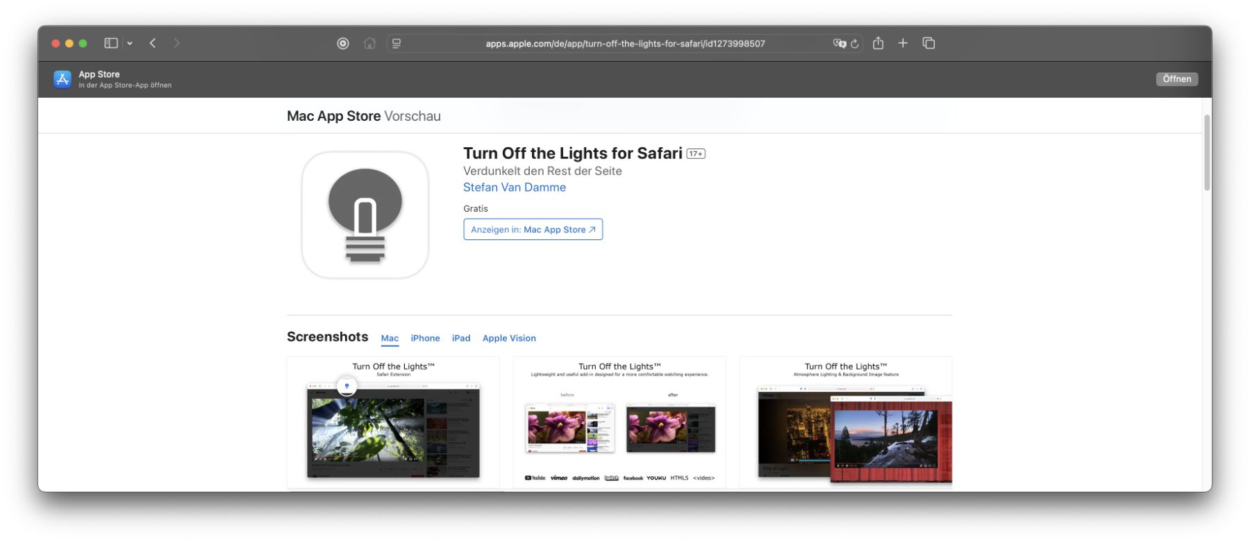 Kostenlos und einfacher kommt die Safari-Erweiterung Turn Off the Lights daher. Sie bietet die Möglichkeit, die gesamte Webseite exklusive des Videoplayers abzudunkeln. So liegt der Fokus klar auf dem abgespielten Video, während die um den Player angeordneten Elemente abgedunkelt werden und somit nicht mehr so stark ins Auge fallen. Statt der Abdunklung kann aber auch eine Grafik über die restliche Seite gelegt werden, etwa ein Theatervorhang.