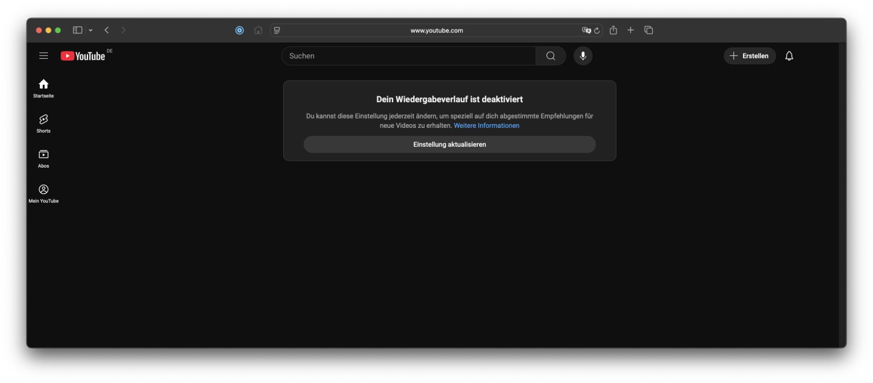 Nutzt man YouTube nun ausschließlich über den Webbrowser, wird man auf der Startseite direkt von zahlreichen Videovorschlägen begrüßt. Doch das muss nicht sein. Denn wenn man den bisherigen Wiedergabeverlauf löscht und das Anlegen eines neuen Verlaufs untersagt, dann gibt es auch keine Vorschläge mehr. Beim Aufrufen von YouTube.com wird mir deshalb seit einiger Zeit eine fast leere Seite angezeigt.