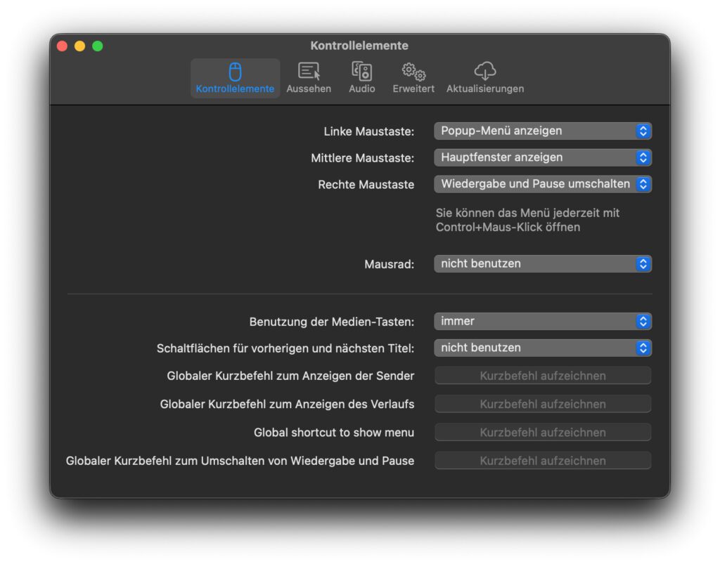 Öffnet man über das Menü des Radiola-Menüleistensymbols die Einstellungen, findet man mehrere Tabs für die individuelle Anpassung vor. Im ersten Tab „Kontrollelemente“ kann z. B. eingestellt werden, wie das Programm auf das Anklicken mit verschiedenen Maustasten reagieren soll. Neben der Anzeige des Menüs ist etwa das Pausieren und Starten der Wiedergabe bzw. das Stummschalten möglich – oder die Anzeige des Hauptfensters.