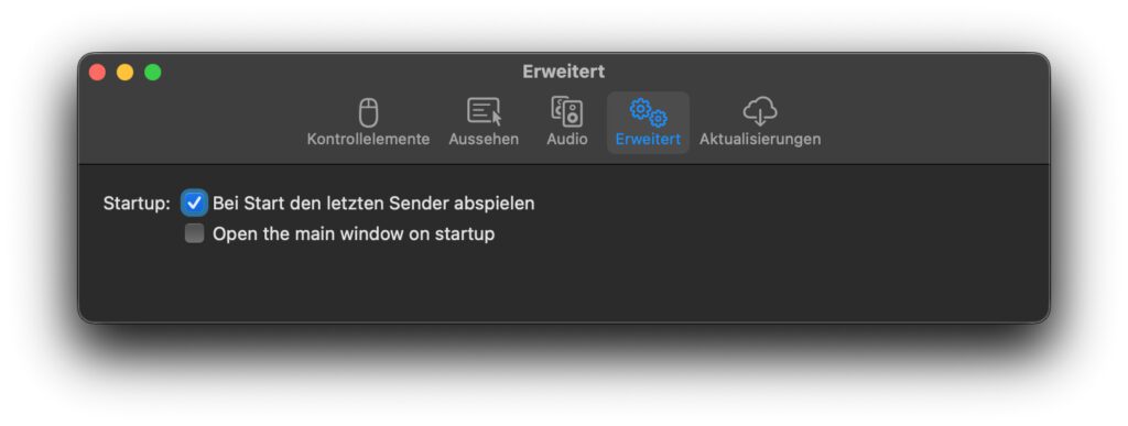 In den weiteren Tabs lässt sich das Aussehen anpassen, ein Audiogerät für die Wiedergabe wählen (praktisch bei Verwendung von externen Audiogeräten wie Bluetooth-Boxen), der Start des letzten Senders beim Öffnen der App aktivieren, und mehr. Das meiste davon ist gut verständlich. Nur ist nicht alles auf Deutsch übersetzt. Hier und da werden einzelne Optionen nur auf Englisch benannt.