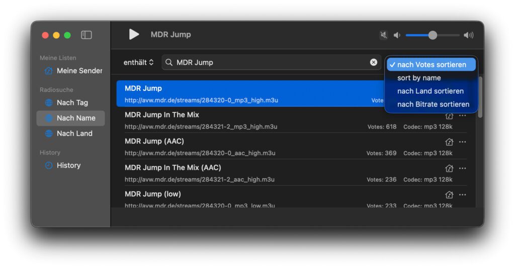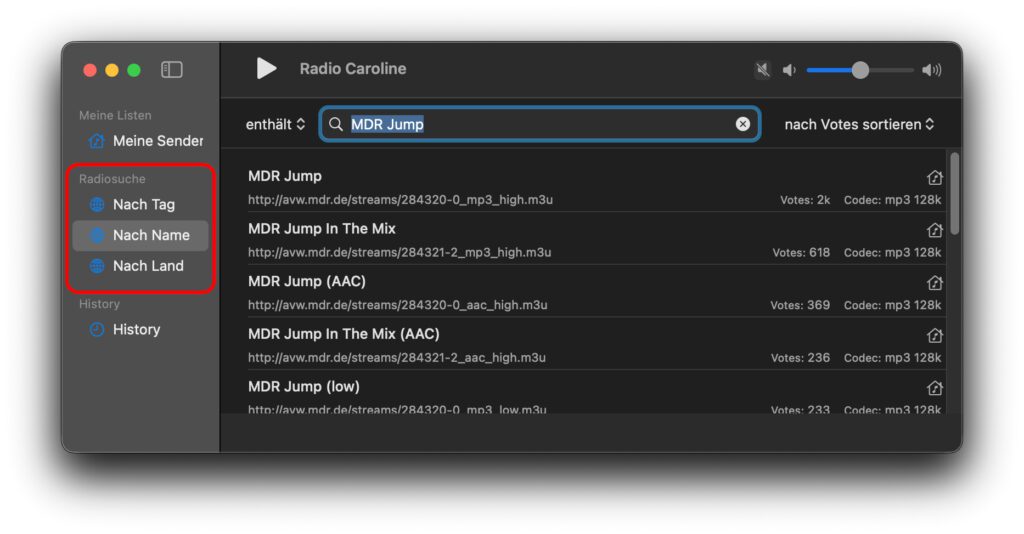 Sucht man nach einem bestimmten Radiosender, sollte man direkt die „Nach Name“-Option auswählen. Das geht am schnellsten. Für die Suchergebnisse werden dabei neben dem Namen auch der Web-Link (URL), der Codec, die Bitrate und so weiter angezeigt. Sogenannte Votes, also Bewertungen, zeigen an, wie oft der Sender favorisiert wurde. Danach wird standardmäßig sortiert. Weiterhin sind Sortierungen nach Name, Land und Bitrate möglich.