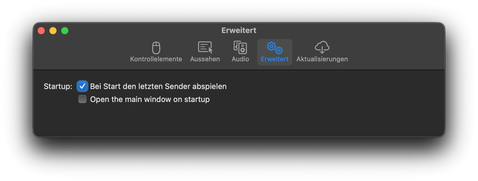 In den weiteren Tabs lässt sich das Aussehen anpassen, ein Audiogerät für die Wiedergabe wählen (praktisch bei Verwendung von externen Audiogeräten wie Bluetooth-Boxen), der Start des letzten Senders beim Öffnen der App aktivieren, und mehr. Das meiste davon ist gut verständlich. Nur ist nicht alles auf Deutsch übersetzt. Hier und da werden einzelne Optionen nur auf Englisch benannt.