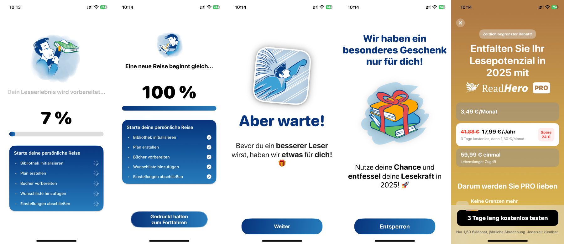 Nach der Installation von ReadHero aus dem iOS App Store muss man sich erstmal ein paar Minuten Zeit nehmen. Denn es gibt eine Einführung in die App sowie ein paar zu beantwortende Fragen zum Leseverhalten sowie zu den aktuellen Lesezielen.