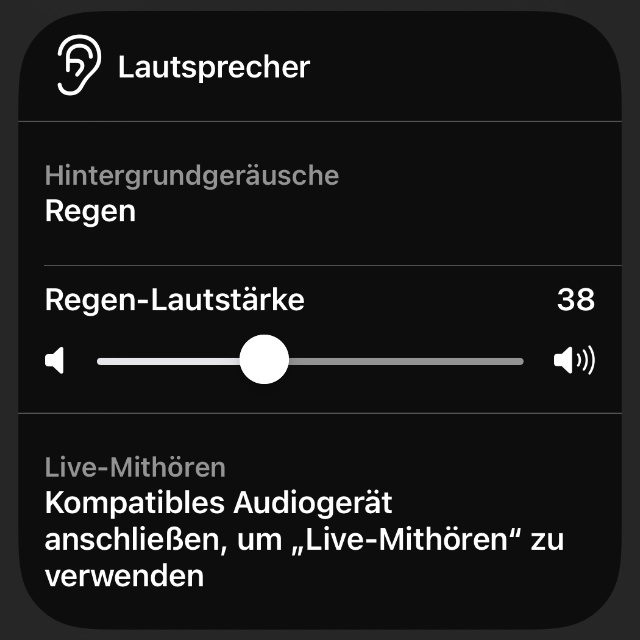 Nun könnt ihr schnell und einfach über das Kontrollzentrum auf die in iOS integrierten Hintergrundgeräusche zugreifen. Dazu tippt ihr einfach das oben aufgezeigte Symbol an. Anschließend tippt ihr auf „Hintergrundgeräusche aus“. Dadurch wird die Wiedergabe gestartet und das ausgewählte Geräusch, z. B. „Regen“, angezeigt. Zudem gibt es einen Lautstärke-Regler.