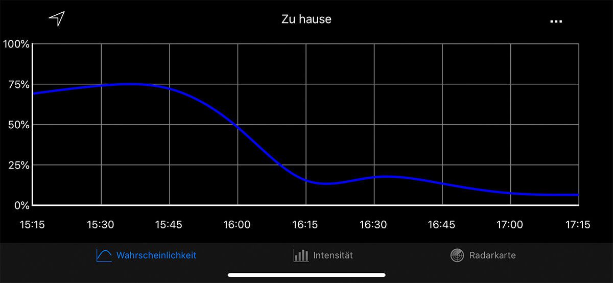 Ebenfalls sehr hilfreich ist der Bildschirm "Wahrscheinlichkeit". Dieser zeigt in einem Graphen die Regenwahrscheinlichkeit über die nächsten zwei Stunden an.