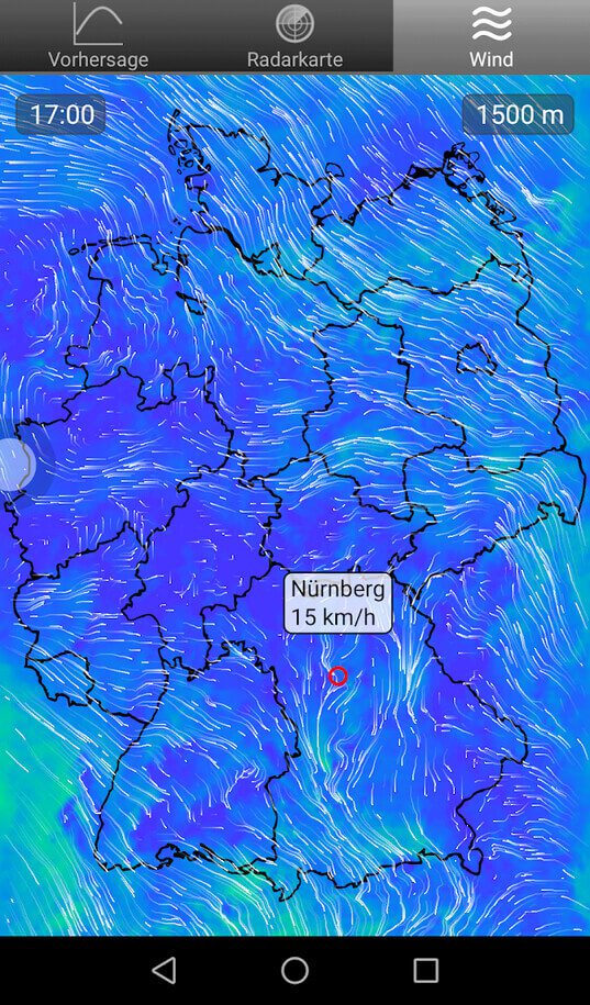 Ich habe eben von Christian noch die Rückmeldung bekommen, dass er ein neues Feature in die App integriert hat, welches in Kürze auch die iOS-Version erreichen wird. Die App wird dabei um einen Tab namens "Wind" erweitert, hinter dem sich eine Karte verbirgt, die ähnlich wie bei der App Ventusky aufgebaut ist. Man sieht auf der Karte Linien, die die aktuelle Windgeschwindigkeit und -richtung darstellen. Ein Touch auf die Karte gibt dann die genaue Geschwindigkeit in Kilometern pro Stunde an (siehe hier im Screenshot bei Nürnberg).