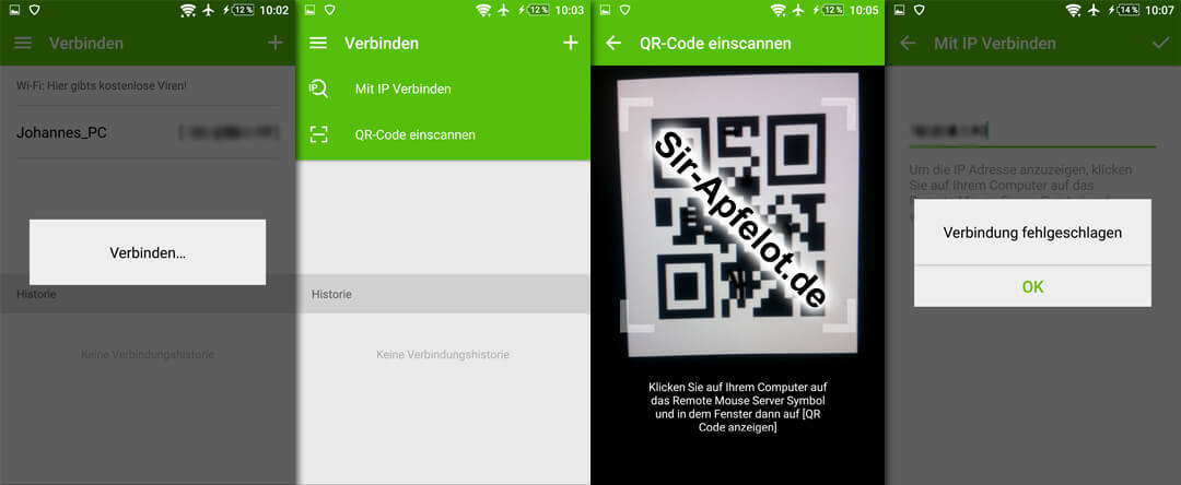 Sowohl auf dem PC oder Mac als auch auf dem Smartphone / iPhone muss die App gestartet werden. Die Verbindung zwischen beiden Geräten wird vom Telefon aus unternommen – wie auf den Screenshots zu sehen ist entweder per Geräteauswahl, IP-Eingabe oder QR Code. (Falls die Screenshots der Remote Mouse App nicht eindeutig sind, lasst eure Fragen als Kommentar da).