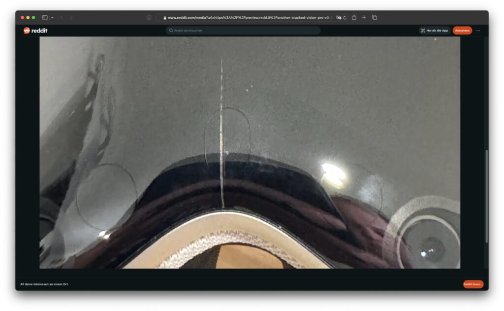 Mehreren Meldungen auf der Plattform Reddit zufolge treten bei einigen „Vision Pro“-Geräten von Apple Risse im Frontglas auf. Dabei handelt es sich nicht um Sturz- oder Stoßschäden, sondern immer um das gleiche Problem: ein plötzlicher Riss, der mittig von unten nach oben verläuft. Mal teilt der Riss das Glas der Vision Pro von der Nasenaussparung bis ganz nach oben zur Stirn, mal nur ein paar Zentimeter bis etwa zur Mitte. Als Ursache wird die verschiedene Ausdehnung vom Aluminium im Innern und dem Glas auf der Außenseite diskutiert. Die Funktionen der VR-Brille seien nicht beeinträchtigt, die Reaktionen im Apple Store bislang unterschiedlich.