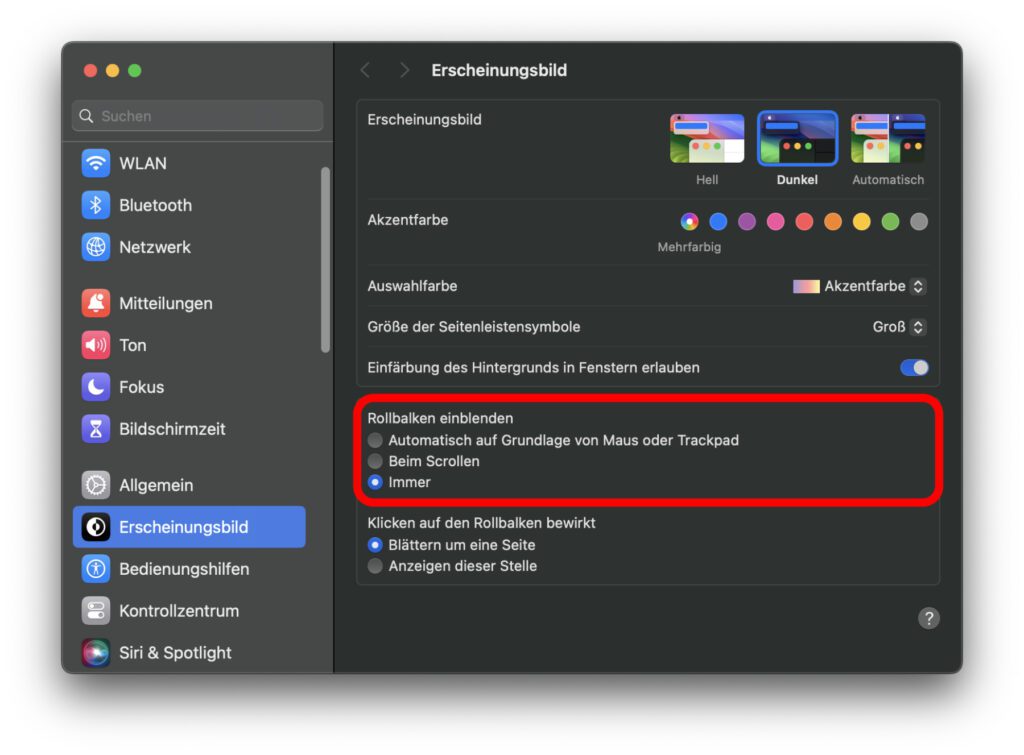 Am Apple Mac die Sichtbarkeit der Scrollbar einstellen
