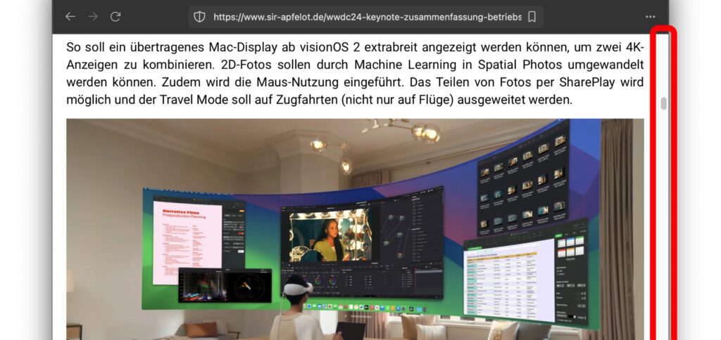 Das Scrollen in Dokumenten und auf Webseiten ist vermittels einer Maus mit Scrollrad oder der Zwei-Finger-Geste auf dem Trackpad kein Problem. Manchmal ist aber auch der Rollbalken, der umgangssprachlich Scrollbalken oder Scrollbar genannt wird, praktisch. Nicht nur dient er dazu, die aktuelle Anzeige auf den gewünschten Bereich zu schieben. Auch ist er ein Indikator dafür, wo auf der Webseite oder im Dokument man sich gerade befindet. Die passenden Einstellungen für die Sichtbarkeit und das Scrollverhalten der Rollbalken in macOS zeige ich in diesem Ratgeber auf.