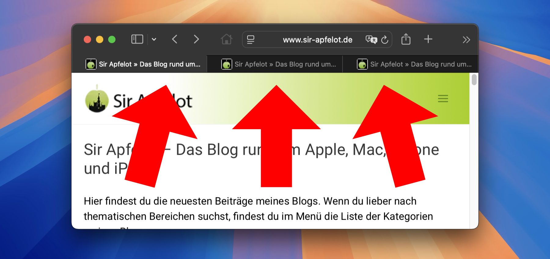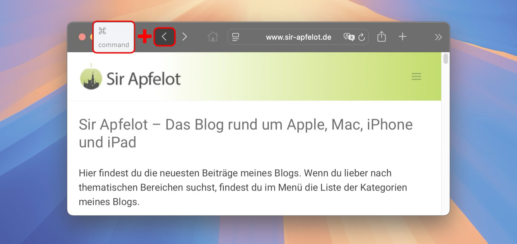 Wenn man also gerade auf einer informativen Seite unterwegs ist, etwa Sir Apfelot oder Wikipedia, dann möchte man vielleicht zusätzlich zur aktuellen Seite noch einmal auf die vorige schauen. Will man beide Seiten parallel nutzen, aber nicht ständig in einem Tab nach vorn und zurück springen, dann hilft der Shortcut command + Pfeil-Button.