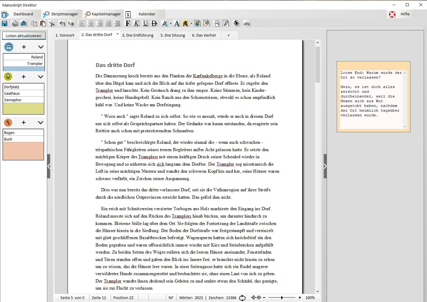 Zudem loben bisherige Nutzer/innen die übersichtliche Struktur von SEITE 1. Der Kalender, der nicht nur für die eigene Organisation genutzt werden kann, lässt sich für die Chronologie der Geschichte nutzen. Handlungsstränge, die parallel oder nacheinander ablaufen, sollen sich in den kommenden Versionen managen lassen. Hinzu kommt dann auch die Möglichkeit, die Geschichte des Romans mit einem Storyboard zu plotten. Das klingt zwar umfangreich, soll aber leicht nutzbar sein, sodass sich eine kurze, steile Lernkurve ergibt. Anders als bei den vorbenannten Apps, die teils eine lange, flache Lernkurve haben.
