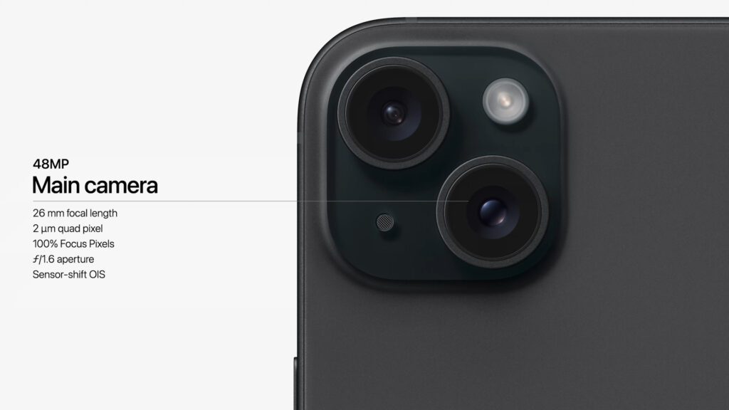 Dann ging es um das Kamerasystem. Das iPhone 15 (Plus) hat nun eine Hauptkamera mit 48 Megapixeln, welche im Hinblick auf Zoom und automatischer Bildverbesserung einige Neuheiten auf das Standard-iPhone bringt. So werden per Computational Photography verbesserte 24MP-Aufnahmen mit dem 48MP-Original zusammengeführt, um Licht- und Farbverbesserungen mit einem hohen Detailreichtum zu kombinieren. Zudem ergibt sich eine 2x-Zoom-Option durch die Nutzung eines 12MP-Ausschnitts.