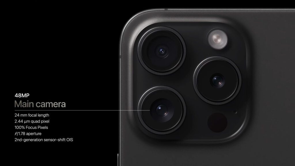 Kommen wir nun zur Kamera des iPhone 15 Pro. Diese bietet 48 Megapixel mit einem größeren Sensor für die 4-fache Auflösung. Wie beim Standardmodell werden Aufnahmen mit geringem Licht auch hier durch Computational Photography in 24MP-Größe mit dem 48MP-Original zusammengelegt, um HDR-Features mit großem Detailreichtum zu koppeln. Die Standardlinse und der Standardzoom lassen sich zudem individuell festlegen, um die Einstellungen beim Kamera-Start nicht immer neu auswählen zu müssen. Fokus- und Tiefen-Steuerung sind nachträglich möglich. Ein neues Smart HDR soll für realistischere Farben sorgen.