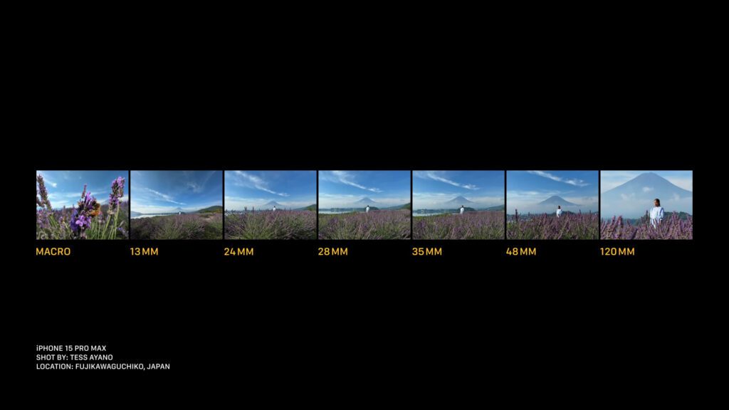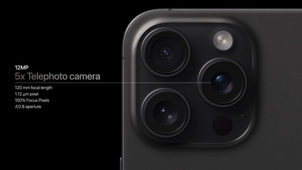 Und damit kommen wir zur Kamera des iPhone 15 Pro Max. Denn wie in einigen Gerüchten bereits hervorgehoben, so gibt es hier die größte Hardware-Änderung. Es kommt nun in einer Linse eine neue Prisma-Technik zur Weiterleitung der Lichtsignale zum Einsatz, welche einen fünffach optischen Zoom sowie eine 120 mm Brennweite ermöglicht. Zudem wurde die Makro-Fotografie hervorgehoben – insgesamt also ein breites Spektrum der Einsatzmöglichkeiten, welche das Äquivalent zu sieben Objektiven darstellen sollen.