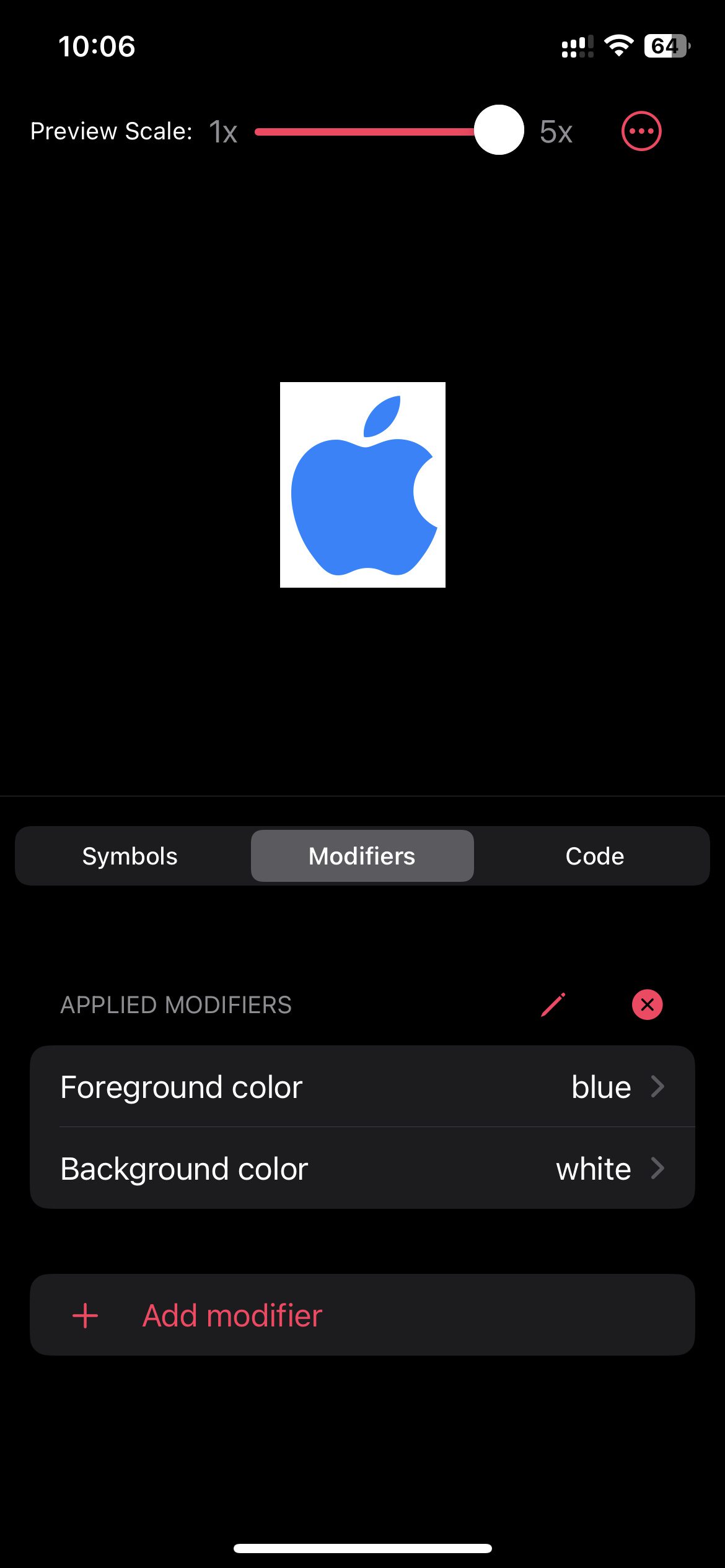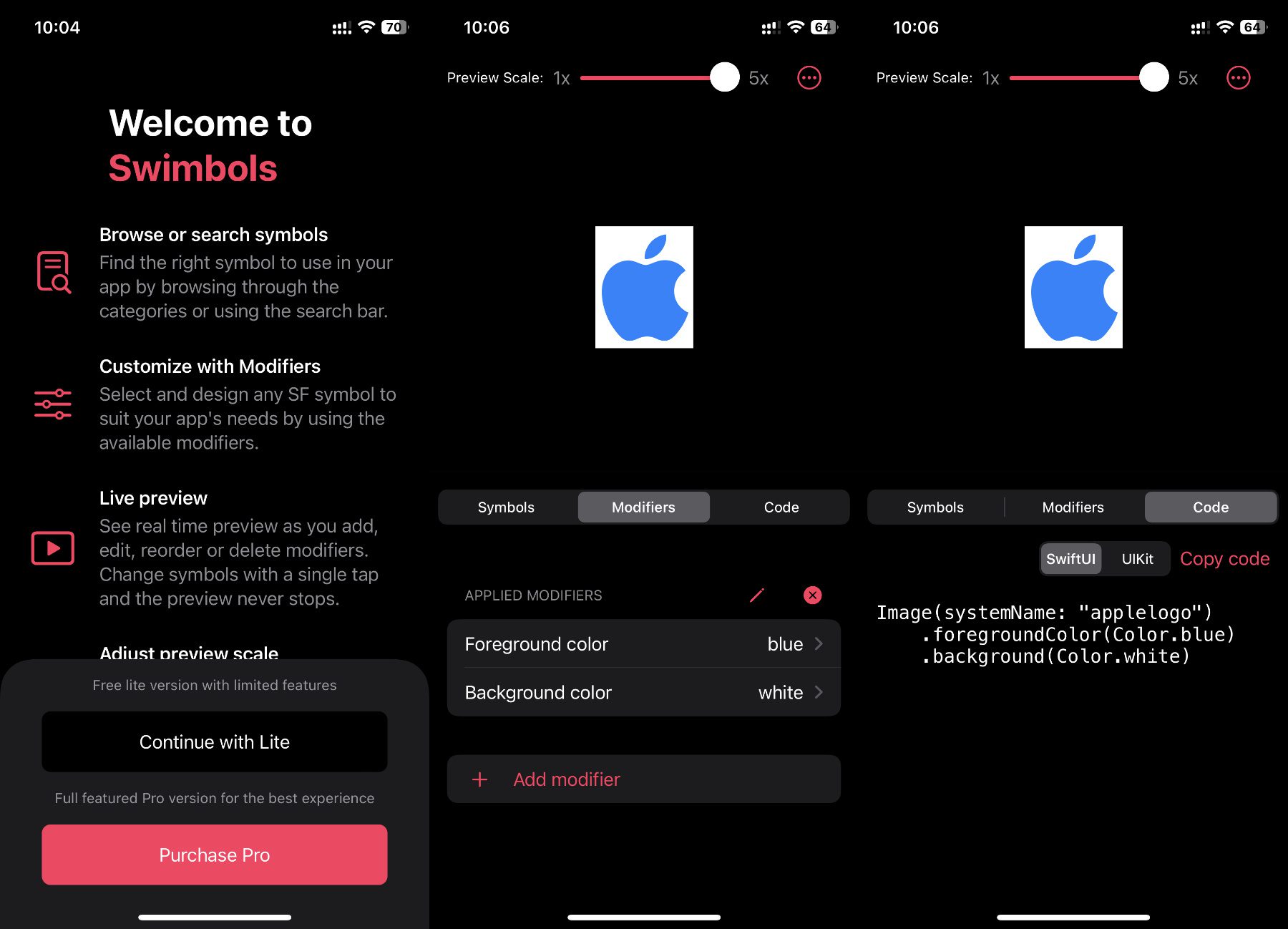 Der Name „Swimbols“ setzt sich aus „Swift“, der Programmiersprache Apples, und „Symbols“ zusammen. Und das ist auch schon ein guter Hinweis auf die umfangreichen Funktionen dieser App. Mit Swimbols könnt ihr am iPhone, iPad und Mac nicht nur einzelne SF Symbole auswählen, sondern sie auch in ihrer Farbe, in der Umrandung, der Hintergrundfarbe sowie in anderen Parametern anpassen. Dazu lässt sich das Symbol einzeln anzeigen sowie nach und nach mit sogenannten „Modifiers“ ausstatten. Dazu steht ein entsprechender Tab unter der Symbolanzeige zur Verfügung. Direkt daneben gibt es den Tab „Code“, aus dem sich der Swift-Code für die erstellte Formen-und-Farben-Kombi kopieren lässt.