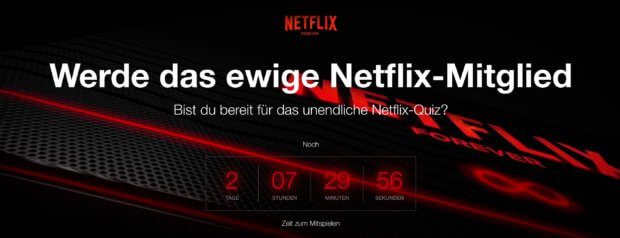 Nun habt ihr aber die Chance auf eine von drei lebenslangen, kostenlosen Mitgliedschaften fürs Streaming in bester Qualität: „Netflix Forever“ heißt die Aktion, die seit gestern und noch bis Sonntag, den 4. März 2018, läuft. Gewinnen könnt ihr die Deluxe-Mitgliedschaft mit einem Quiz (Facebook-Login nötig); wenn ihr die meisten Fragen in Reihe richtig beantwortet, dann habt ihr eine Chance (bester Score bisher: 130 Fragen; mein Score: 16 Fragen). Hier findet ihr das Netflix Forever Quiz: https://netflix-forever.de